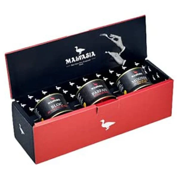 Caja regalo con 3 latas de parfait de foie de pato, foie gras de pato y mousse de foie de pato con trufa.